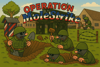 Tegelijkertijd blijven de mollen onverstoorbaar doorgaan met hun ondergrondse activiteiten, alsof ze deel uitmaken van de sappeurs van de Genie. Omdat hun ‘tactische manoeuvres’ opvallend goed aansluiten bij de recente Defensiecampagnes waarin belangstellenden worden uitgenodigd om onder meer ‘in het groen’ te komen werken, hebben wij deze situatie omgedoopt tot “Operation Molestrike”: ‘in het groen’, door het groen.